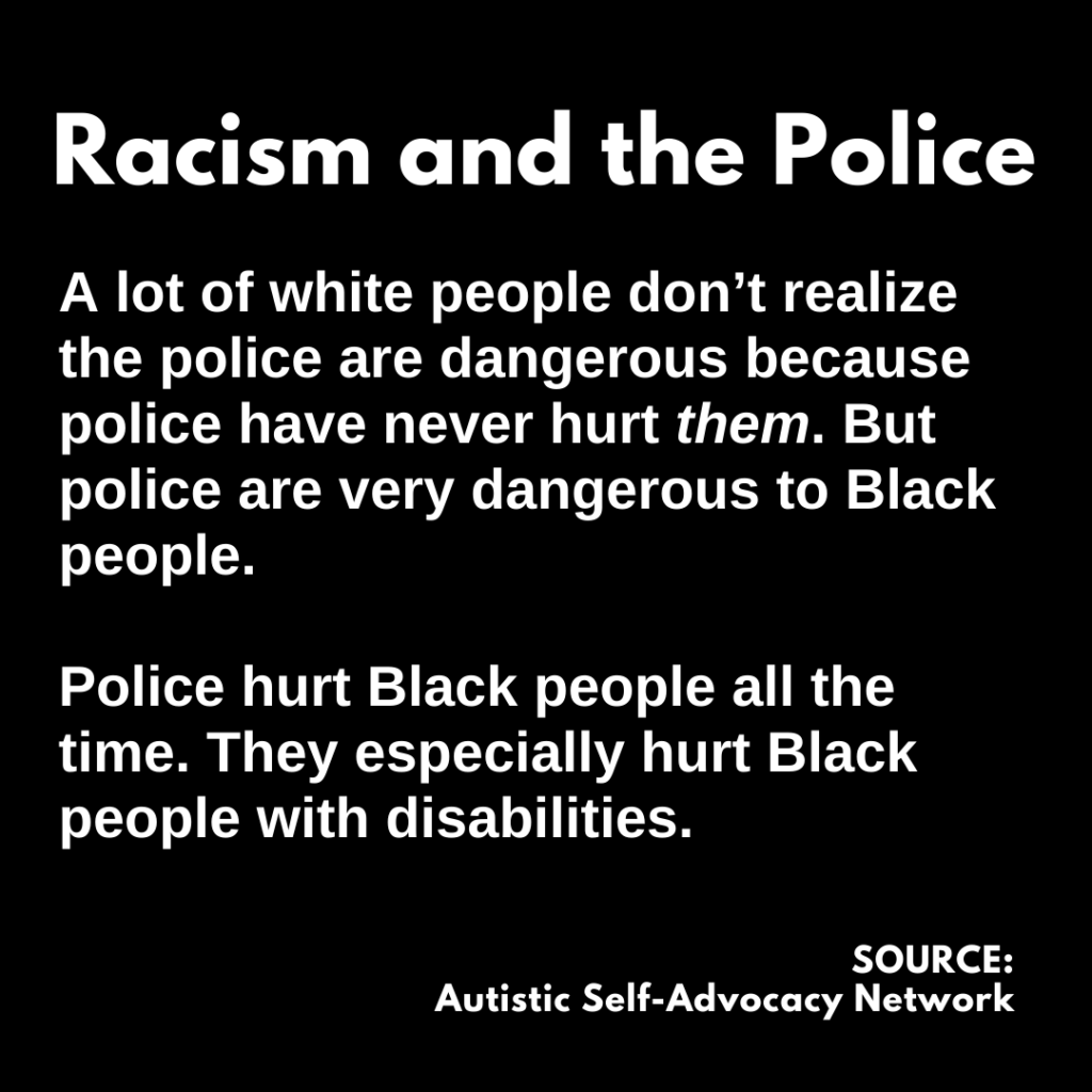 Where did this information in support of these statements come from? As the slides noted, the source for this material is the Autistic Self-Advocacy Network (ASAN) – a national group that recently released a “plain language” report (.pdf) on “anti-black racism.”