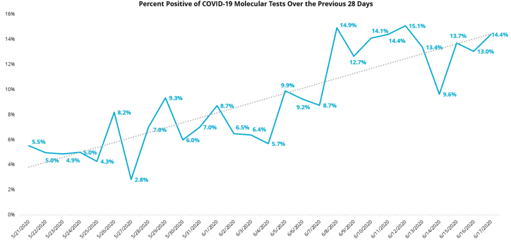 According to the latest batch of data released by SCDHEC, 14.4 percent of tests from the previous day came back as positive, continuing an upward trend after this figure bottomed out at just 2.8 percent late last month.