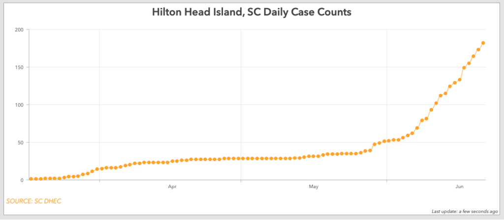 Just one month ago, on the Friday before Memorial Day — the official start of tourism season on the island — Hilton Head Island only had 35 confirmed COVID-19 cases. By Monday, 185 Hilton Head residents had tested positive.