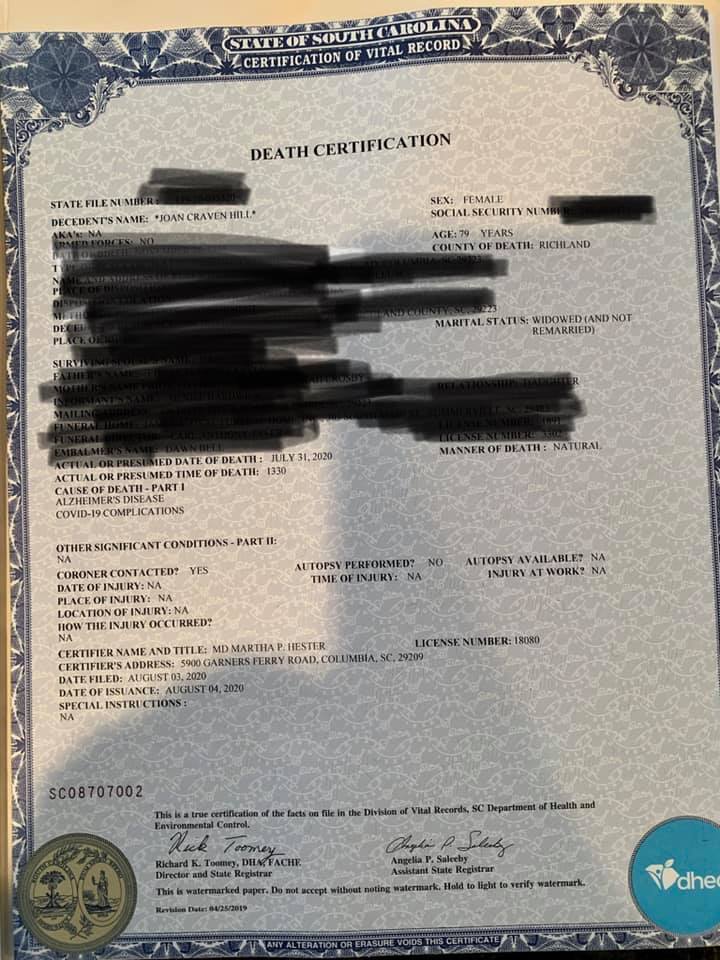 This week, a South Carolina resident posted something deeply personal on social media raising what we believe to be legitimate and important questions about a Covid-19 fatality that was allegedly misclassified.