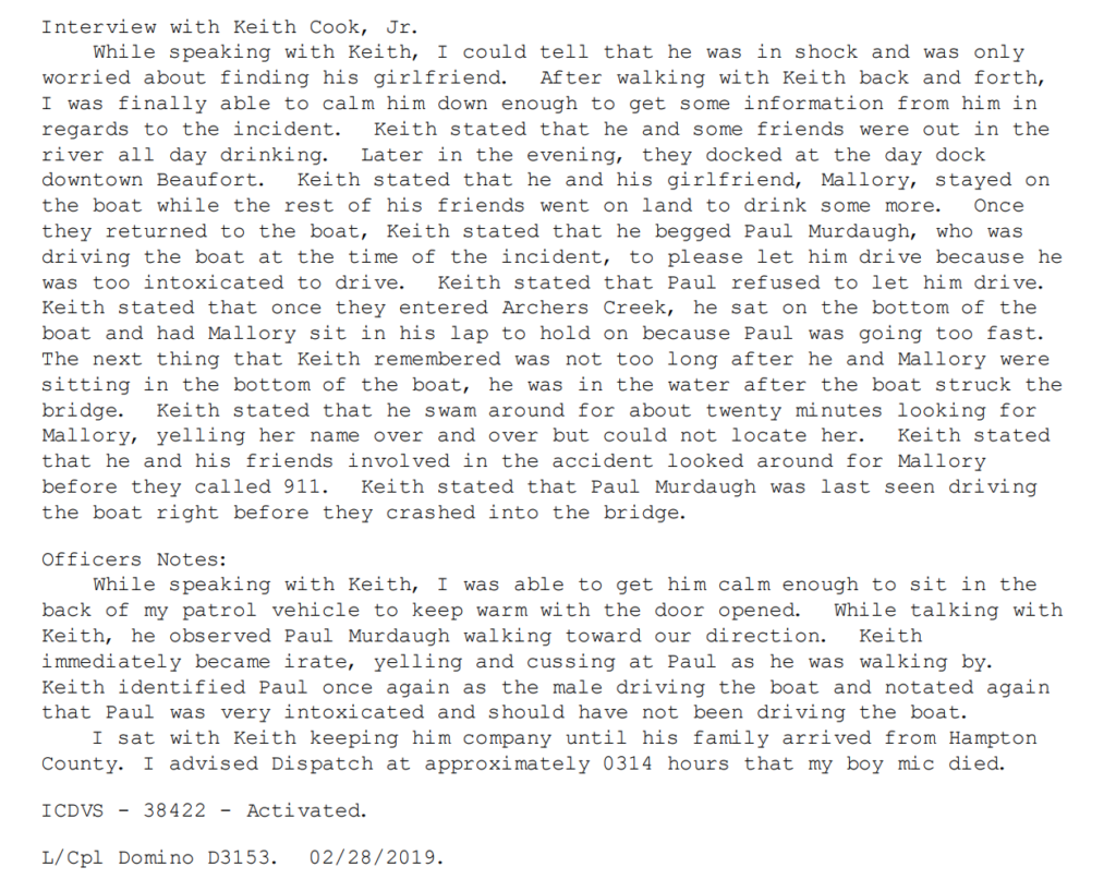 In fact, Mallory Beach’s boyfriend — Keith “Anthony” Cook – told Domino multiple times that night that Paul Murdaugh had been driving the boat at the time of the crash and that Murdaugh was heavily intoxicated.