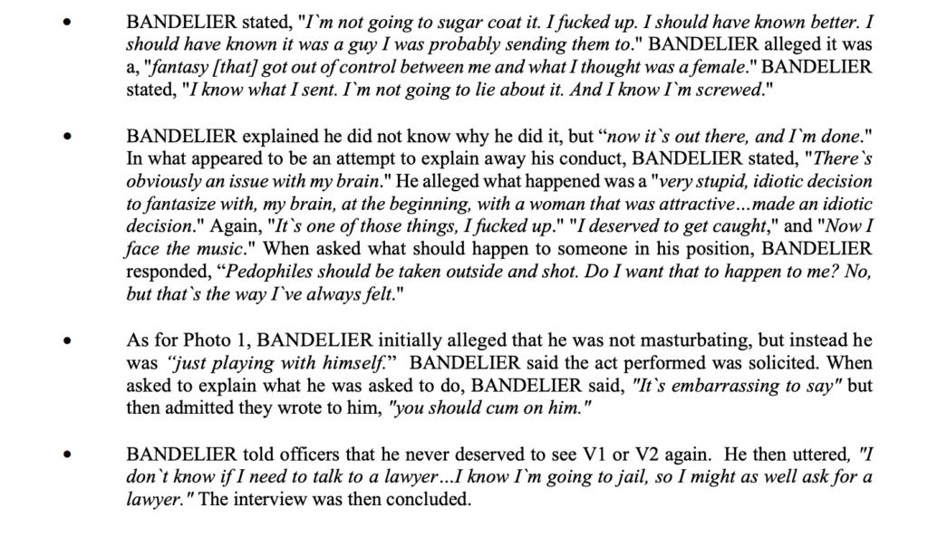 “I’m not going to sugar coat it. I f*cked up. I should have known better,” Bandelier told police. “I should have known it was a guy I was probably sending them to.”