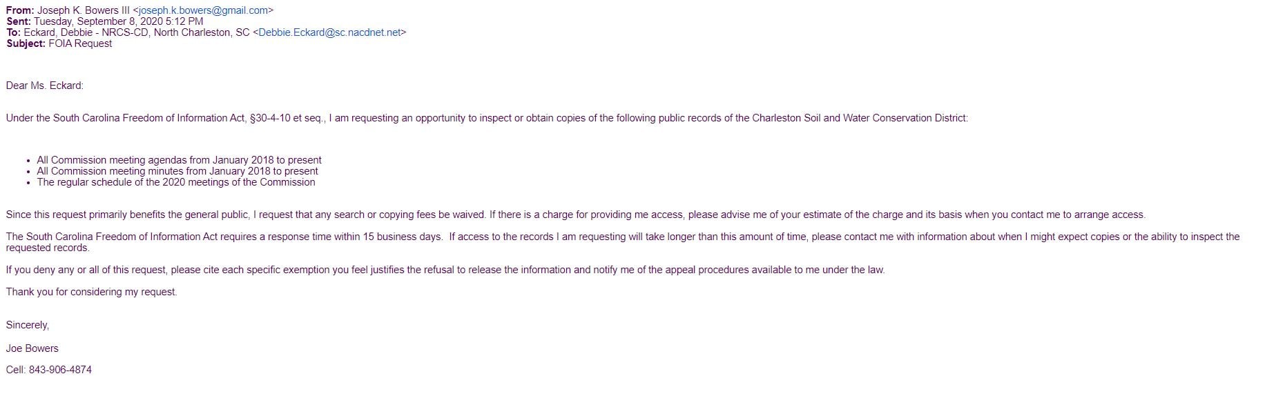 A candidate for a Lowcountry conservation post is demanding transparency from the government agency he hopes to represent. Joe Bowers – who ran unsuccessfully last year for chairman of the Charleston county Republican party – recently posted screencaps of an email exchange he had with the manager of the Charleston Soil and Water Conservation District.