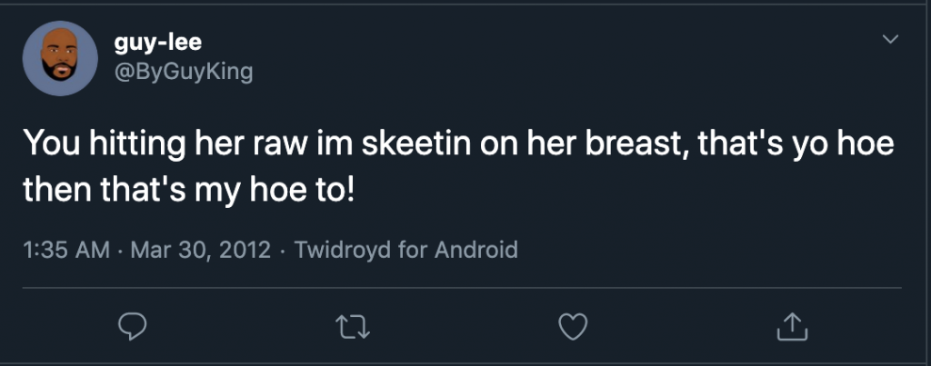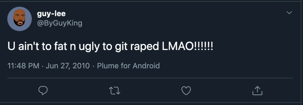 In one tweet dated June 27, 2010, King referred to a sexual assault victim as not being to “fat” and “ugly” to get raped. In another tweet dated March 19, 2011 he described how he told a “female” that she was “gone (sic) have to suck (his) dick” until he fell asleep.