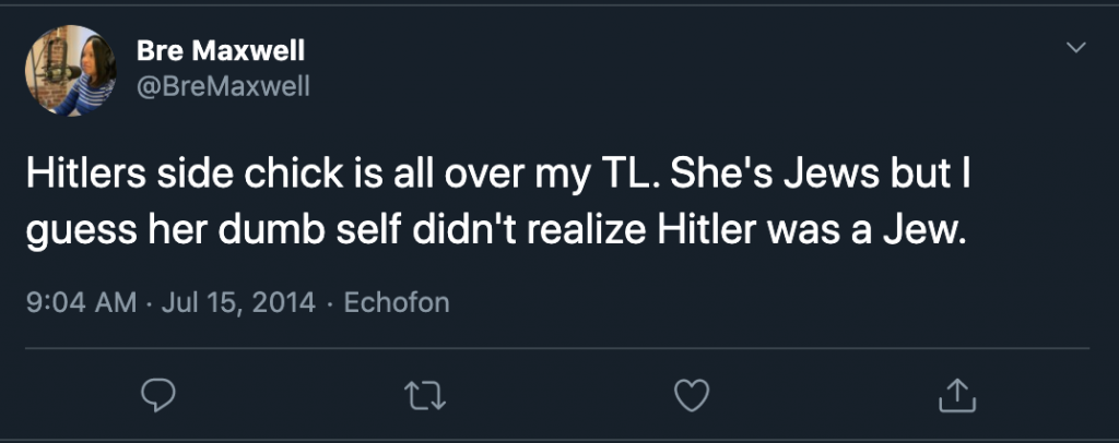 “She’s Jews but I guess her dumb self didn’t realize Hitler was a Jew,” she tweeted.