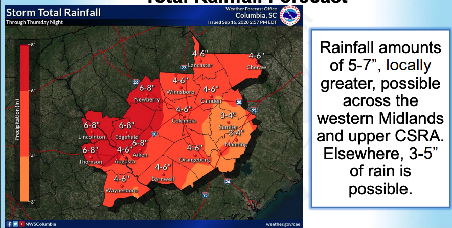 The Midlands expects to see the most rain in South Carolina with 5-7 inches possible in some areas, and 4-6 inches in Columbia. Here’s a map showing total rainfall from the storm: