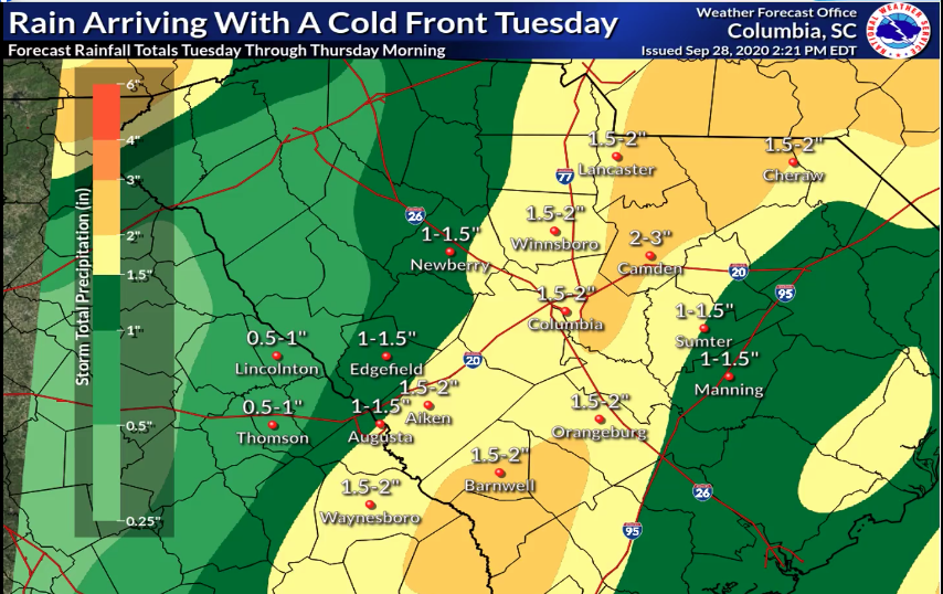 The Lowcountry should get less than an inch of rain, while 1-3 inches of rain are expected across the Midlands, according to the National Weather Service.