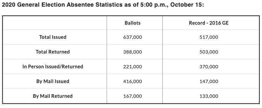 Meanwhile, 221,000 ballots have been returned in person for a total of 388,000 returned ballots. That figure is shy of the 2016 record of 503,000 returned absentee ballots – but there are still seventeen days before the return deadline.