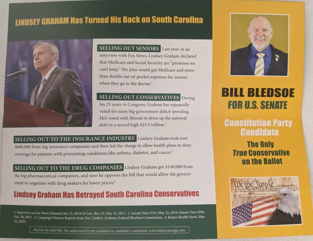 A national political action committee called Lindsey Must Go sent out mailings this week touting Bledsoe as “the only true conservative on the ballot.”