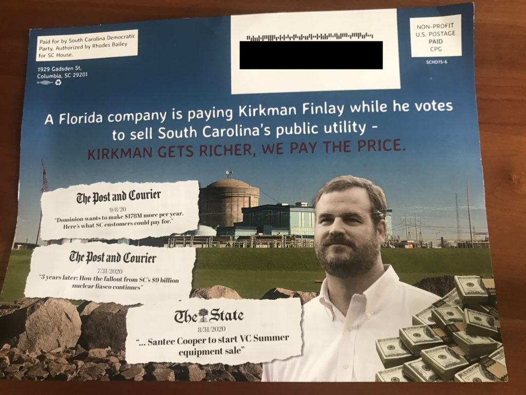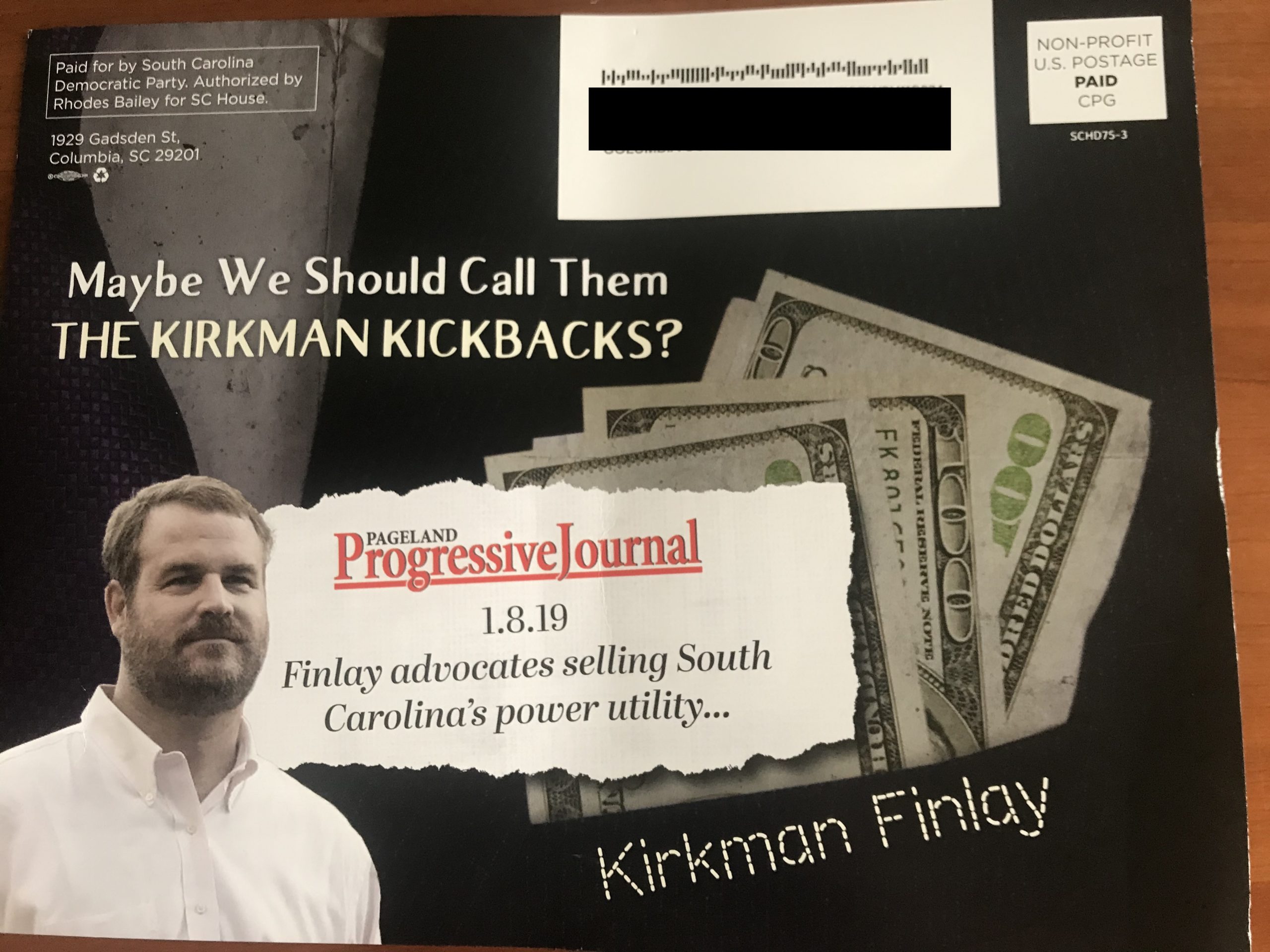 “A Florida company is paying Kirkman Finlay while he votes to sell South Carolina’s public utility,” one of the mail pieces alleged.