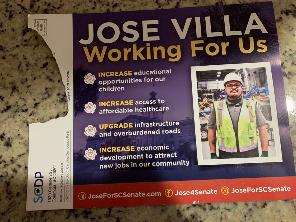 Voters in Lexington county, South Carolina were mystified this week when they received a mailing in support of Jose Villa, a Democrat running for S.C. Senate District 4 (.pdf) against veteran “Republican” Mike Gambrell.