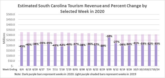 All told, revenues are now down 43 percent on a year-to-date basis – a tremendous blow to the Palmetto State’s economy. Also, weekly revenue losses have ranged between 31 percent and 40 percent for nineteen consecutive weeks – assuming you discount the first two weeks in September.