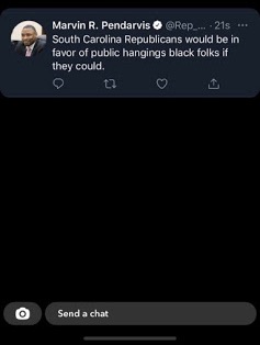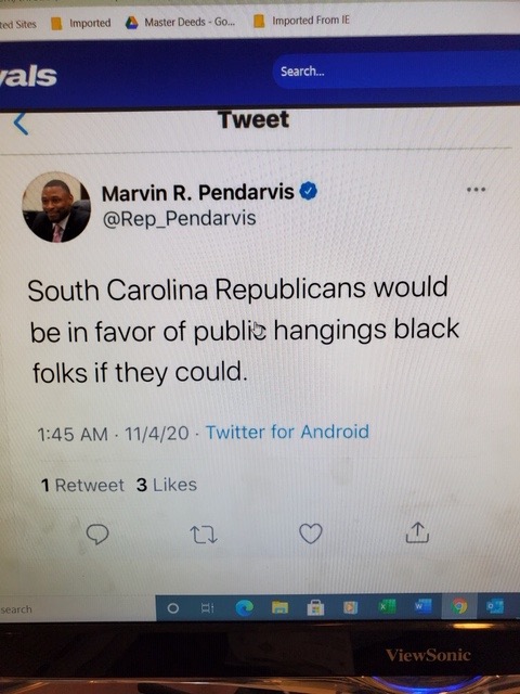 This morning, a pair of sources forwarded us separate screen captures of a tweet allegedly posted early Wednesday morning by S.C. state representative Marvin Pendarvis – a Democrat who has represented the heavily gerrymandered S.C. House District 113 (.pdf) in the Palmetto Lowcountry since 2017.