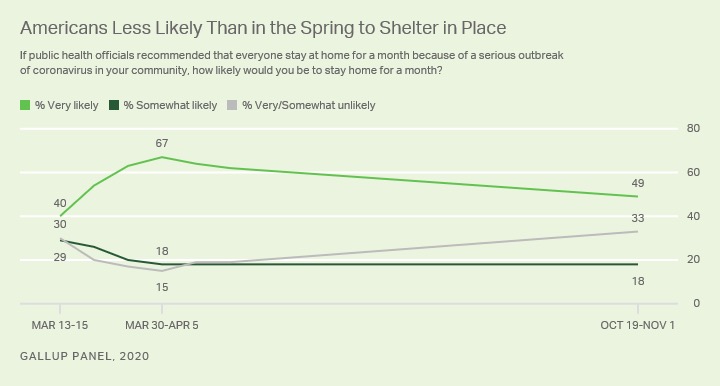 Saad noted this rating “contrasts with solid majorities in the spring who said they were likely to comply with such shelter-in-place advice.”