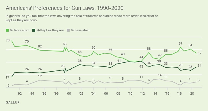 Gallup has been tracking public perceptions on gun laws since 1990, when a record-high 78 percent of Americans said they wanted stricter laws on firearms.