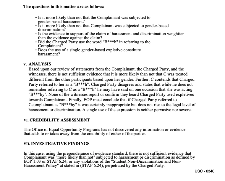 Finally, USC officials concluded their investigation (below), and determined that there was not enough evidence to support Dunavant’s claims that Voros violated university policy.