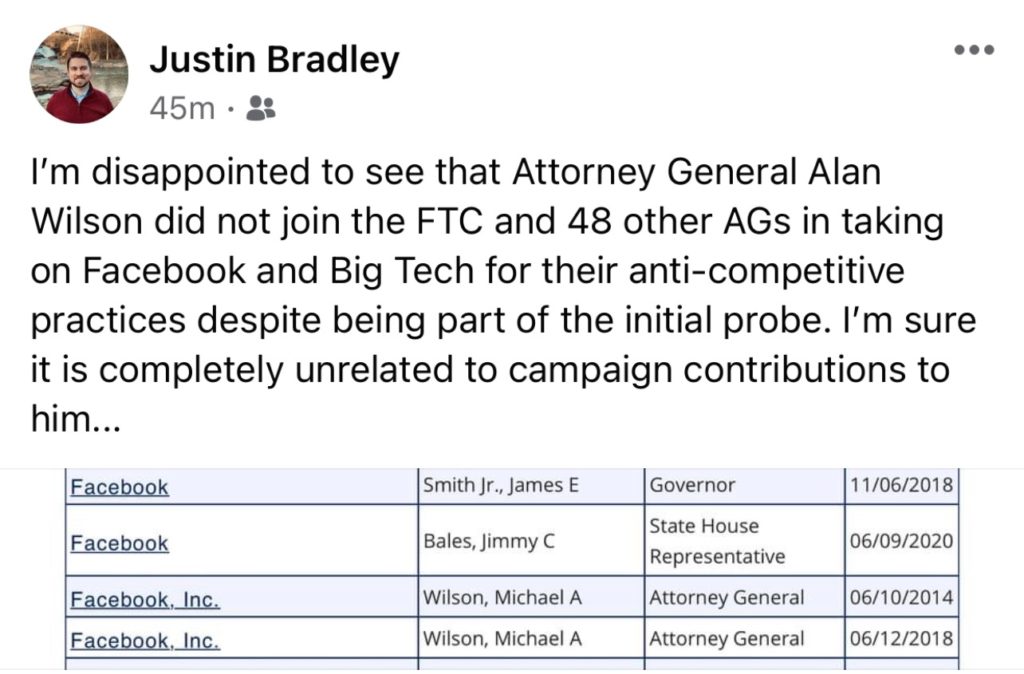 Justin Bradley – a Greenville, S.C. attorney who formerly served as a county councilman in Spartanburg county – wrote earlier this month (on his Facebook page, ironically) that he was “disappointed” Wilson did not join the Federal Trade Commission (FTC) and 48 other attorneys general “in taking on Facebook and Big Tech for their anti-competitive practices.”