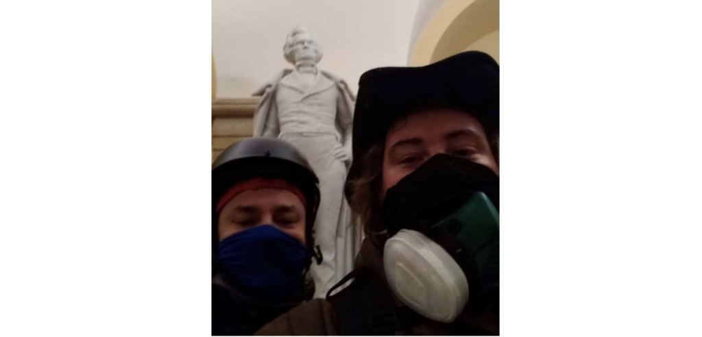 The tipster provided a photograph that shows Hatley and another man taking a selfie with the John C. Calhoun statue inside the U.S. Capitol during the time of the riots (below).