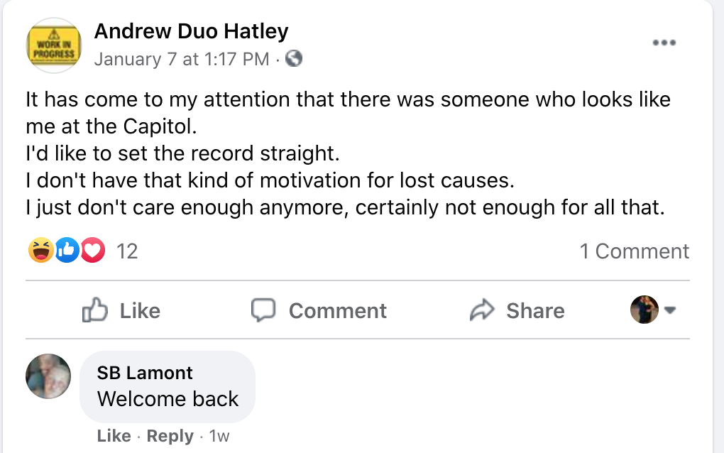 FBI investigators found a Facebook profile that appeared to show Hatley denying having any involvement in the Capitol riots in a post (below).