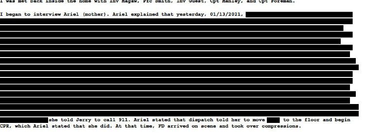 According to the heavily redacted report, it appears that first responders on scene immediately suspected child abuse. The fire department placed a call to the police department for child abuse/ aggravated assault and emergency protective custody at 2:25 p.m.