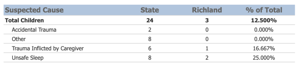 In 2020, 24 children in South Carolina died due to maltreatment. Richland County had the most child fatalities caused by maltreatment in 2020.