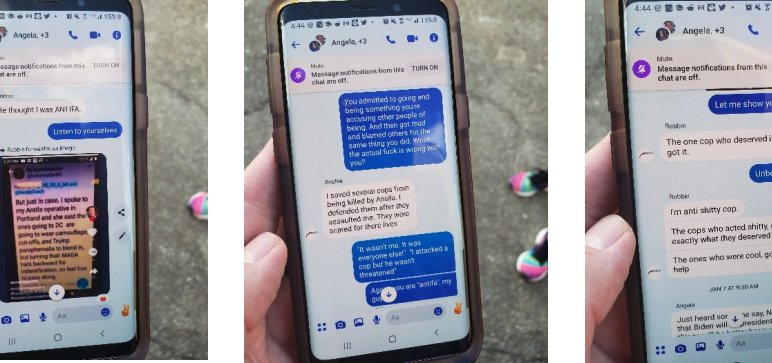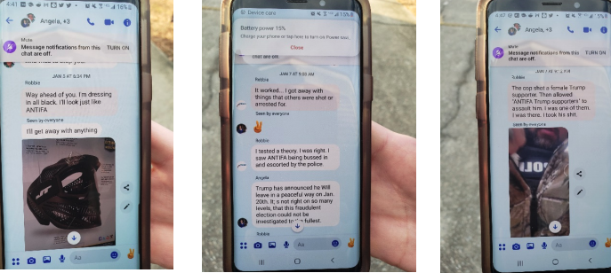 “The cop shot a female Trump supporter,” he texted the group at 9 a.m. Jan. 7. “Then allowed ‘ANTIFA Trump supporters’ to assault him. I was one of them. I was there. I took his shit.”