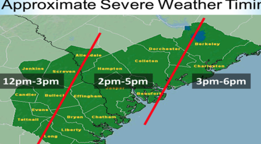 In the Lowcountry, the worst threat will be between 2 and 5 p.m. for Jasper, Beaufort, and Colleton County, and between 3 and 6 p.m. in Charleston County, according to the NWS.