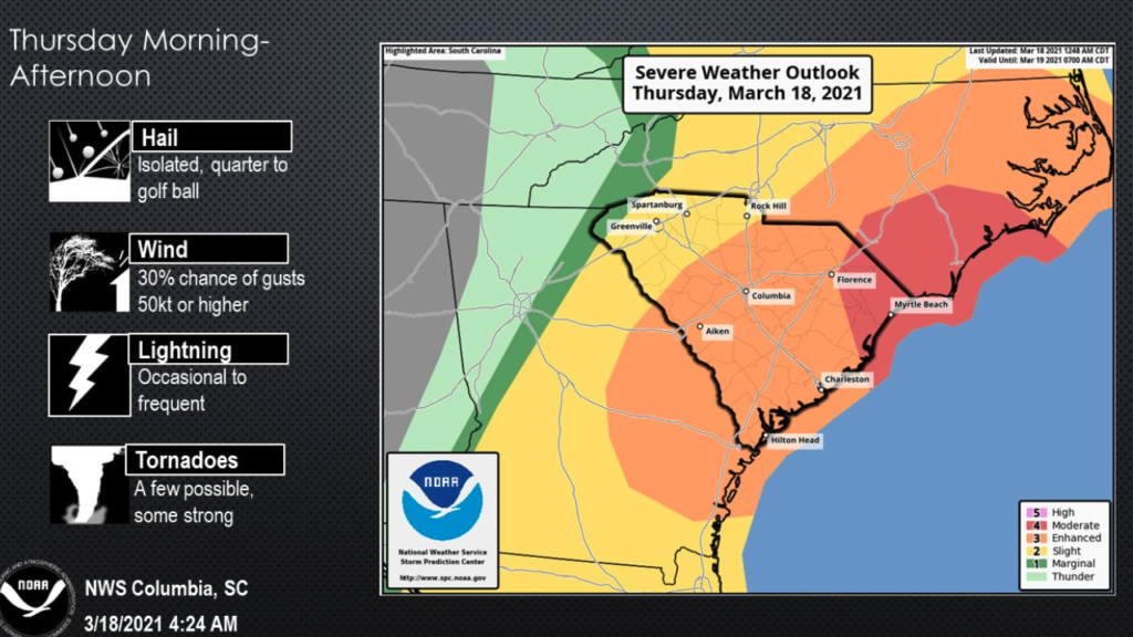 the highest impacts including possible strong tornadoes,” meteorologists at the National Weather Service in Columbia said.