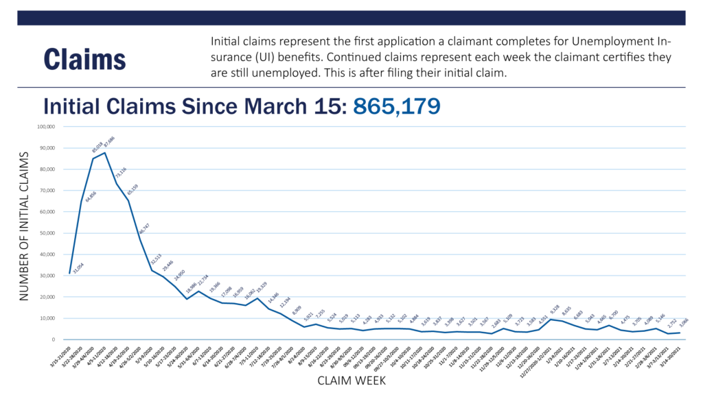 According to the latest data from the S.C. Department of Employment and Workforce (SCDEW), a total of 3,066 new initial unemployment claims were filed in the Palmetto State during the week ending March 20, 2021 – the one-year anniversary of the unprecedented jobless spike accompanying the Covid-19 shutdowns.