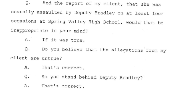 “Unfortunately, Jane Doe’s complaints were not taken seriously, and Deputy Bradley remained at Spring Valley High School,” court documents filed by the plaintiff’s attorney said. “This caused Jane Doe’s mental health to deteriorate to the point of being hospitalized for 50 days for suicidal ideations.”