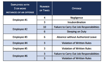 Auditors reviewed a random sample of 80 SCDJJ employees and found that 43 percent had one or more disciplinary actions. Several had three or more reprimands in their HR file (see chart below).