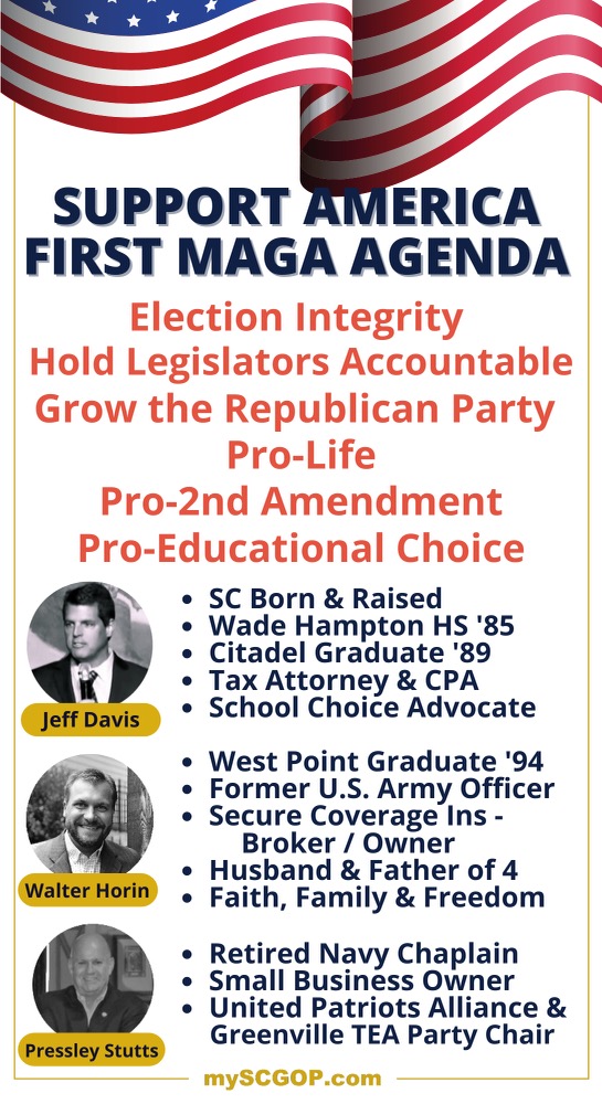 In addition to Davis, the MAGA slate includes local businessman Walter Horin and Greenville tea party leader (and Trump event organizer) Pressley Stutts. Horin is running for county vice chairman, while Stutts – a former chaplain in the U.S. Navy – is running for Greenville’s seat on the SCGOP executive committee.