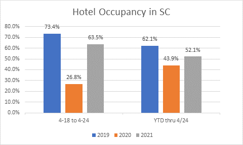 Looking at occupancy rates, South Carolina saw an estimated 63.5 percent of its rooms filled during the week ending April 24. That number was up 136.8 percent from the equivalent week a year ago but down 13.4 percent from the equivalent week in 2019. On a year-to-date basis, occupancy rates are 18.7 percent above where they were in 2020 but 16.1 percent below where they were in 2019.