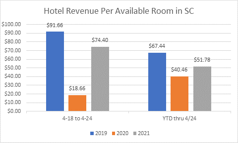 According to data published by the S.C. Department of Parks Recreation and Tourism (SCPRT) on Friday, revenue per available room – or “RevPAR” – stood at $74.40 during the week ending April 24, 2021. That number was up 298.6 percent from the equivalent week in 2020 – when societal shutdowns tied to the Covid-19 pandemic essentially shuttered the industry.