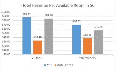 According to the latest data from the S.C. Department of Parks, Recreation and Tourism (SCPRT), revenue per available room – or “RevPAR” – stood at only $56.80 for the year through May 15, 2021. While that figure is 47.7 percent higher than it was at this point a year ago, it remains 19.2 percent below where things stood at this same point in 2019.