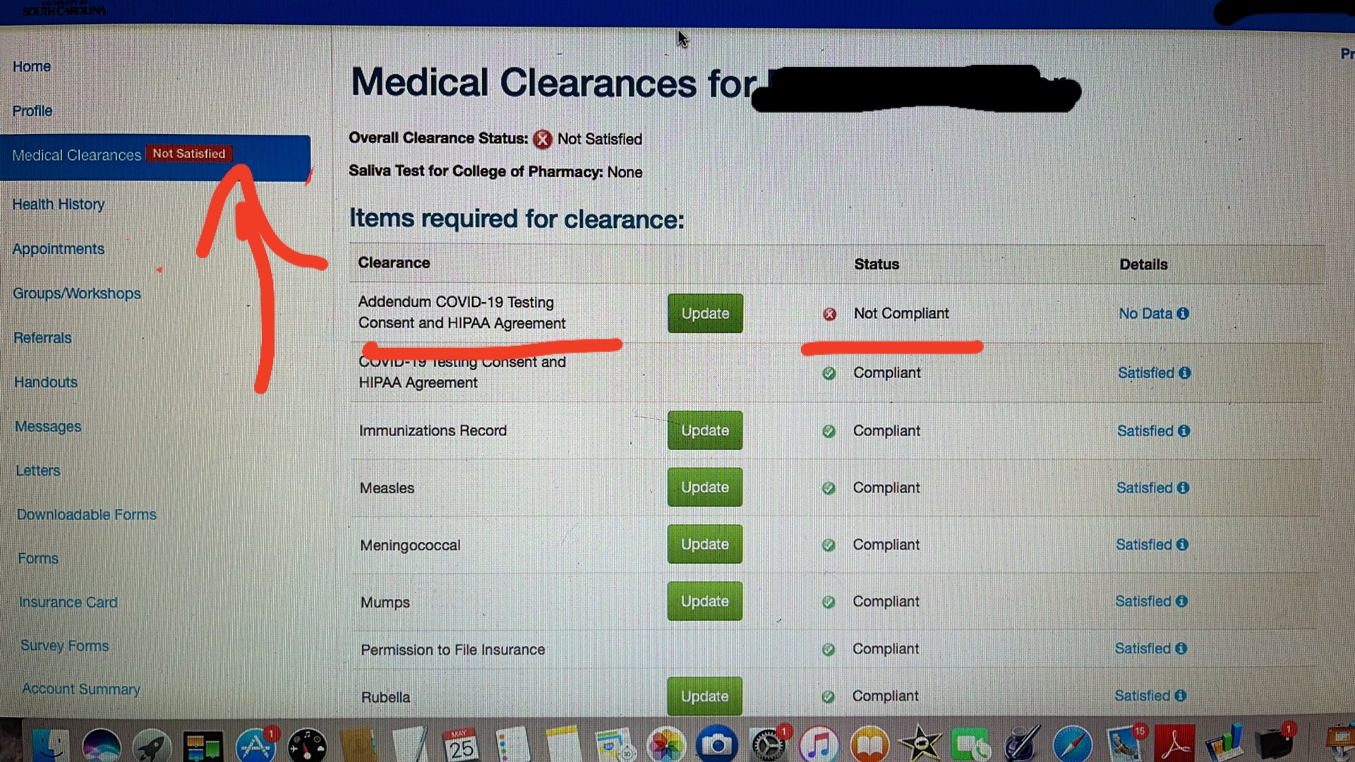 As the screen capture above indicates, a student’s failure to consent to waiving his or her HIPAA rights results in a “not compliant” designation by the school – which in turn leads to the student’s medical clearance being record as “not satisfied.”