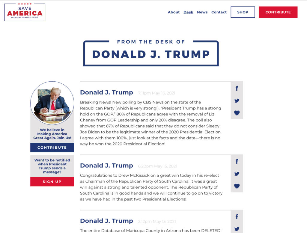 The blog – entitled “From the Desk of Donald J. Trump” – was a subpage on his official site, which is affiliated with the Save America joint fundraising committee.