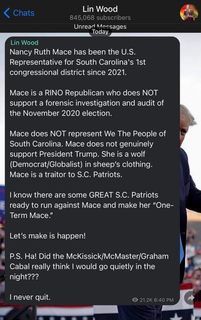 Wood upped the ante with a Telegram post last week referring to Mace as “a wolf (Democrat/ Globalist) in sheep’s clothing” as well as “a traitor to S.C. patriots.”