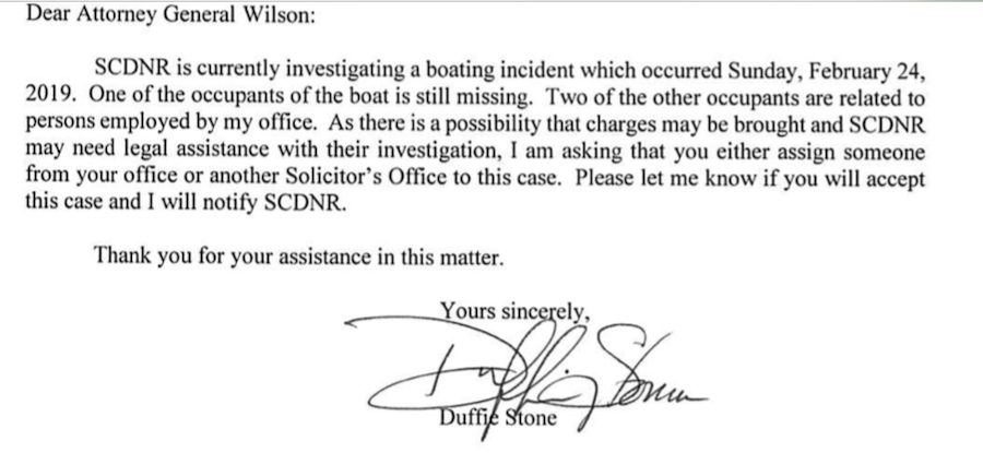 “In that case, it was immediately apparent Mr. Murdaugh would be a suspect, that his father owned the boat in which those involved were traveling and that other passengers were related to employees of my office,” Stone wrote.