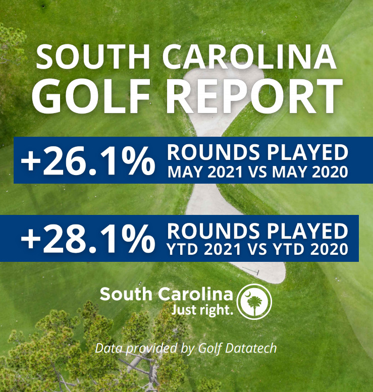 In addition to publishing updated hotel RevPAR and occupancy data, SCPRT released data from Golf Datatech last week showing a major uptick in the total rounds of golf being played in the Palmetto State. For the month of May, total rounds played were up 26.1 percent from the same month in 2020 while year-to-date the increase stood at 28.1 percent, according to the data.