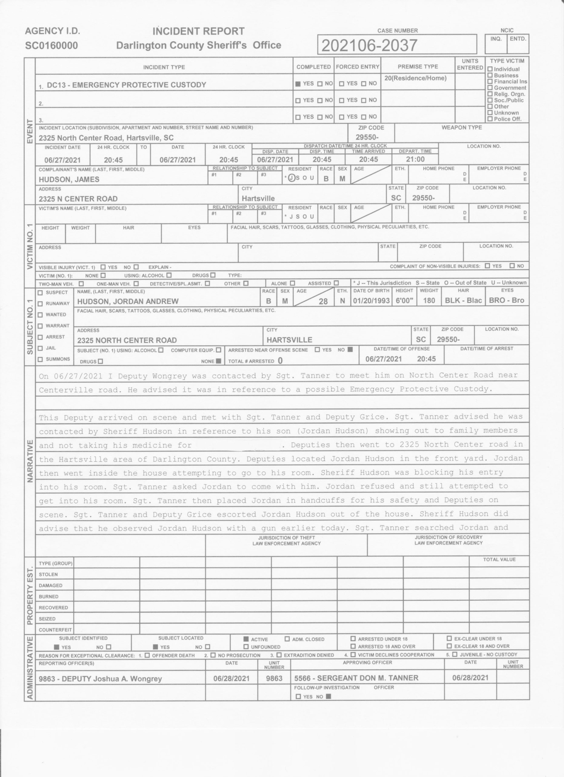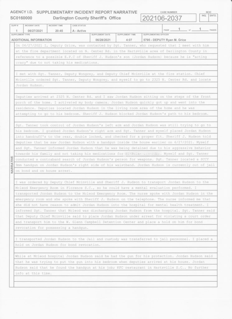 At around 8:45 p.m. EDT on Monday, June 27, 2021, Darlington deputies were advised by sheriff Hudson that his son had been “acting crazy” and “showing out” to family members. The sheriff also advised his deputies that his son was refusing to take medication for an undisclosed condition. Upon arriving at Hudson’s home in Hartsville, S.C., deputies encountered the sheriff and his son in the midst of a heated disagreement.