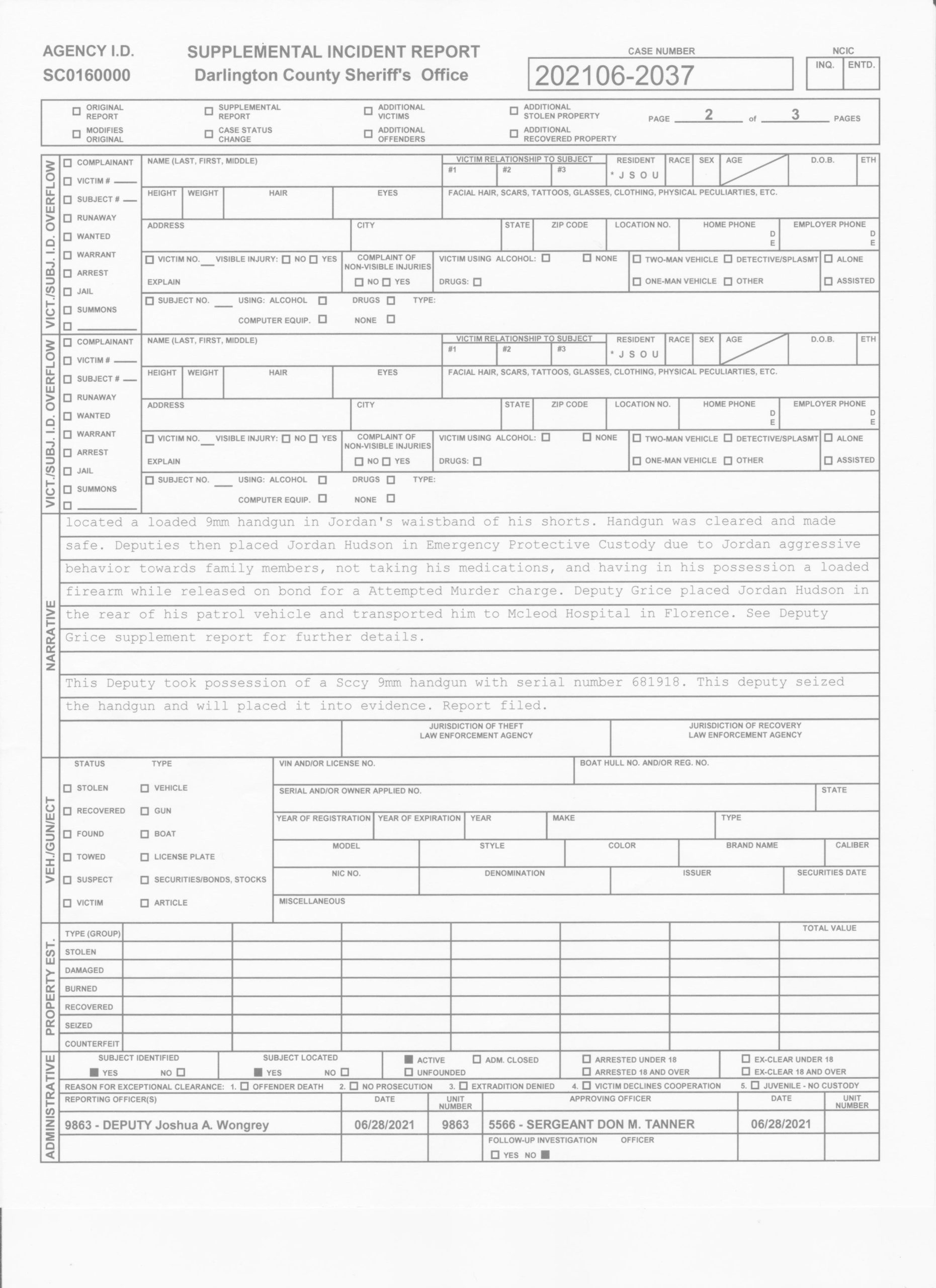 As for the circumstances which led to Jordan Hudson’s bond being revoked, the narrative laid out in this incident report raises a number of questions. Chief among them? If sheriff Hudson indeed observed his son carrying a handgun “earlier” in the day on the date of his arrest (as the report stated), then why did he not immediately summon deputies to the scene to arrest him?