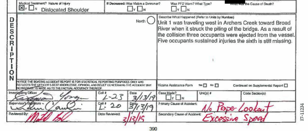 It appears as though Brock filled out the initial DNR crash report that listed “no proper lookout” and “excessive speed” as the primary and secondary causes of the accident. Alcohol was not mentioned.