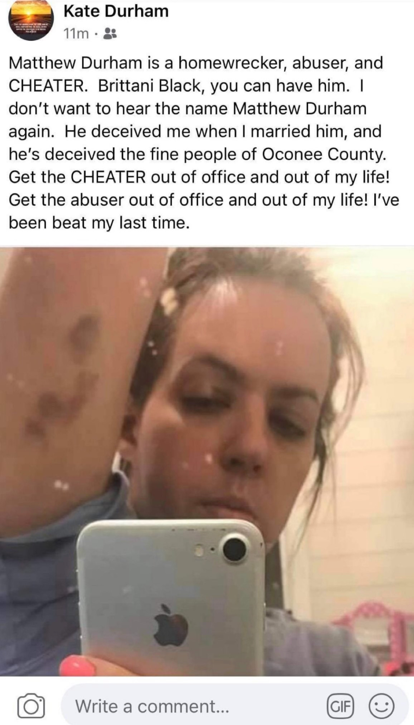 “I don’t want to hear the name Matthew Durham again,” she wrote. “He deceived me when I married him, and he’s deceived the fine people of Oconee county.”