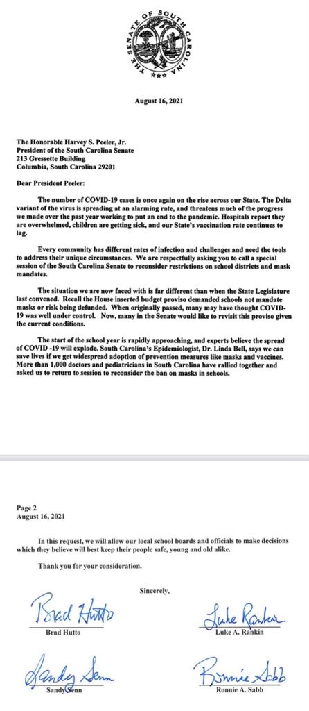 Rankin was one of the four senators urging Peeler to bring lawmakers back to Columbia for the purpose of scrapping a “House-inserted budget proviso (which) demanded schools not mandate masks or risk being defunded.” The others were Senate minority leader Brad Hutto of Orangeburg, Democrat Ronnie Sabb of Greeleyville and “Republican” Sandy Senn of Charleston.