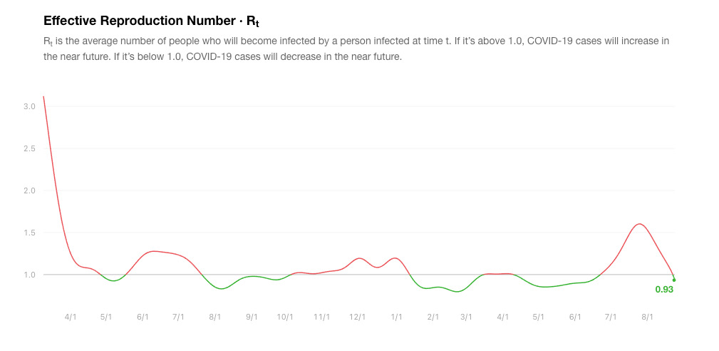 Amid the bleak outlook there is one distinctly positive number to report, though. As of Thursday, August 19, 2021, South Carolina’s Rt – or “effective reproduction number” – dipped to 0.93, according to the latest data from Yale University. For those of you unhip to the science, Rt is “an important metric of epidemic growth” because it helps predict whether a virus will expand or contract in the near future.