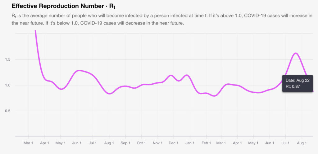 As the graph below indicates, South Carolina’s Rt as of August 22 was 0.87 – and falling. In fact, it is now at its lowest level since May 18.