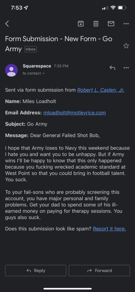 “I hope that Army loses to Navy this weekend because I hate you and want you to be unhappy,” the message began. “But if Army wins I’ll be happy to know that his only happened because you fucking wrecked academic standard(s) at West Point so that you could bring in football talent. You suck.”