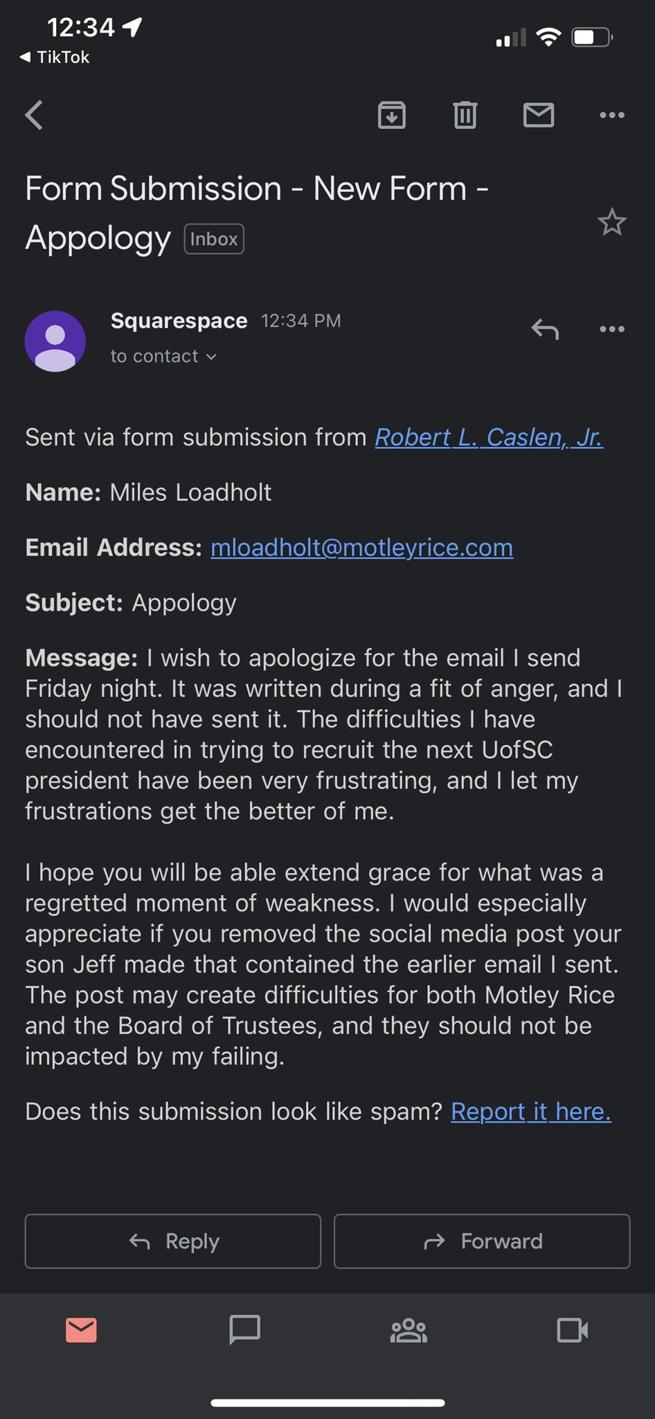 Both messages were sent from an individual using the name and email address of South Carolina trustee Miles Loadholt, an attorney from Charleston, S.C. who was one of the eight trustees who voted against Caslen in 2019.