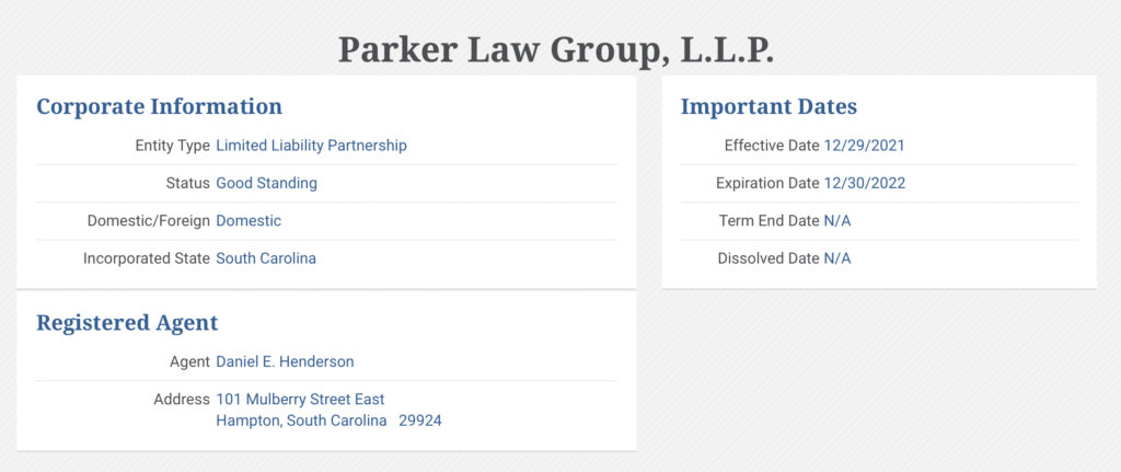 On Dec. 29, Daniel E. Henderson of Peters Murdaugh Parker Eltzroth and Detrick filed paperwork with the South Carolina Secretary of State’s Office for a new firm located at 101 Mulberry Street in Hampton — the same address of PMPED — but bearing the name Parker Law Group LLP.